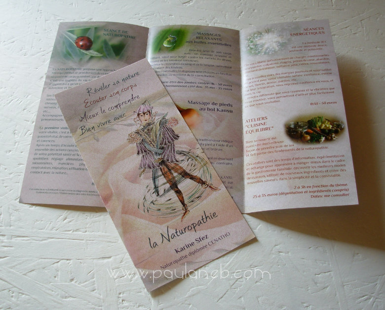 Karine m'avait déjà confié la réalisation de sa communication en 2014. Elle est revenue vers moi 2 ans plus tard pour refaire son dépliant. Elle souhaitait également que je revoie l'ambiance de son essence visuelle, tout en concervant le personnage "L'être nature" que j'avais dessiné au départ en technique mixte, encre et crayons de couleur aquarellés.