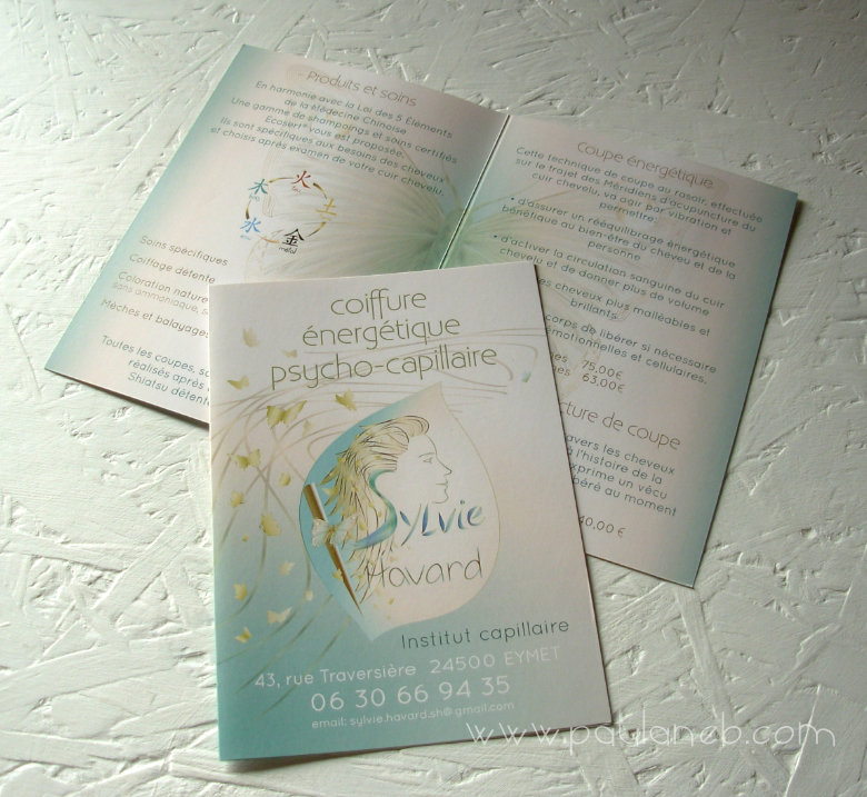 Sylvie souhaitait revoir l'ambiance colorée de la première essence visuelle que j'avais conçue pour elle en 2013. Affectionnant particulièrement la couleur vert d'eau déjà présente sur cette dernière, elle voulait toutefois quelque chose de plus en accord avec les nouvelles orientations prises dans son activité. La coupe énergétique pratiquée par Sylvie Havard favorise en douceur les transformations profondes de l'être. Des papillons, symboles de la transformation sont ajoutés et des tons or et sable apportent à la fois douceur et scintillement léger à l'ensemble. Une illustration d'un grand papillon sera crée pour orner l'intérieur du dépliant.